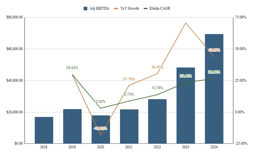 Figure 6: Ashtead Technology Adj. EBITDA, YoY Growth, and CAGR, 2018-2024, from company filings and Dragon Field Investing