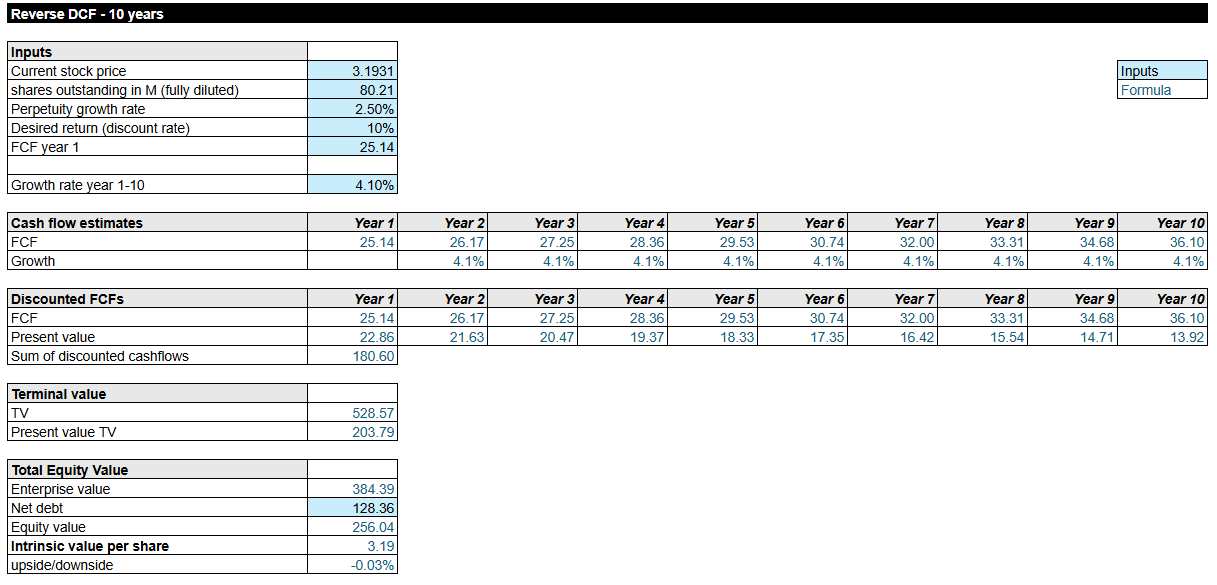 We can also value Ashtead Technology by conducting a Reverse DCF analysis. To do so, we have to calculate the free cash flow for year 1. Althought 2025 is almost over, we will use this year as year 1. Assuming a revenue of £203 million, a gross profit margin of 77% and and operating income ratio of 26% the net income is project at £35 million. Adjusting for depeciation & amortization (£27 million) and capital expenditures (£35 million - as shared by management) and taking a change in Net Working Capital of -£7 million, as Ashtead will increase invetory to support their expected growth. We calculated a FCF of £25 million for year 1. If we use this number as the start point for year 1 in the DCF calculation, and use 2.5% for the terminal growth rate and 10% for the desired discount rate, the Reverse DCF model shows that the market at the current (December 22, 2025) price of £3.19 per share, prices in a growth of free cash flow of 4.1% per year for the next ten years, as shown in Figure 16. Recall that in Figures 5 and 6, we showed that Ashtead Technology had grown its revenue and EBITDA YoY in 2024 at 52% and 44%, respectively. For the period from 2018 to 2024, the company grew its revenue and EBITDA at a CAGR of 28% and 27%, respectively.