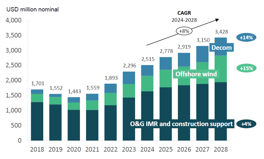 According to Rystad Energy, the total addressable market (TAM) for the specialty subsea equipment rental is projected to grow at 8% CAGR from 2024 to 2028, with offshore wind the highest at 15%, followed by O&G decommission (14%), and O&G IMR (Inspection, Maintenance, and Repair) & Construction support (4%), as shown in the figure below. As more offshore wind facilities are installed, they will require increasing IMR services and, eventually, decommissioning. This will provide more IMR revenue stream in the coming decades.