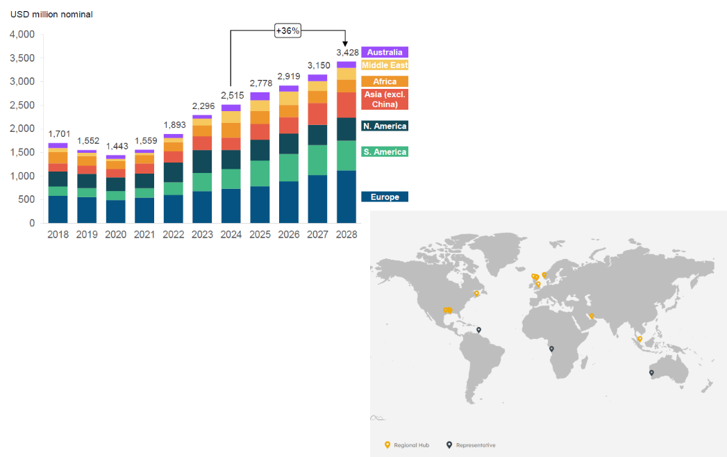 Geographically, AT services customers in Europe, South and North America, Australia, the Middle East, Africa, and Asia (excluding China). As indicated in the figure below, AT is well-positioned to benefit from growth across all key offshore geographies.