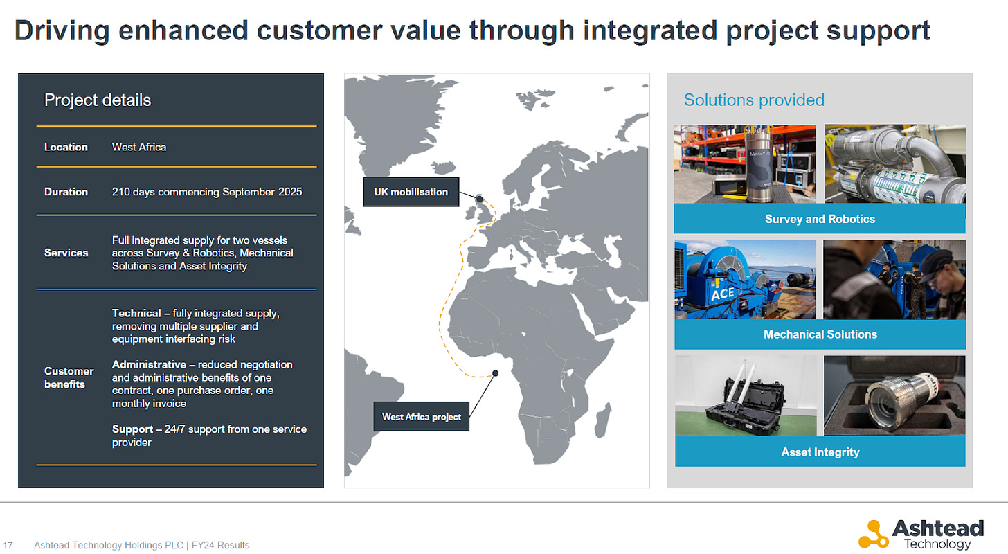 The company has publicly signaled its intention to reduce leverage over the subsequent 12–18 months. Ashtead Technology’s strategy of acquiring complementary, strategically located rental fleets has both delivered scale and increased cross-sell opportunities (e.g., 85% of its rental equipment is fungible across oil & gas and renewables).