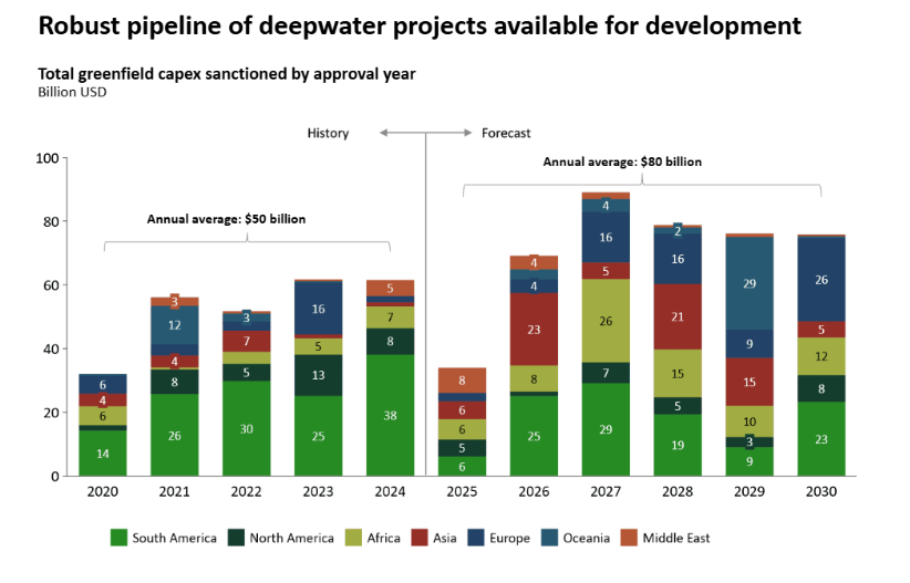 In a recent presentation, offshore and energy expert Rystad Energy predicted significantly higher offshore capital expenditure spending, averaging $80 billion per year from 2025 to 2030, compared to the $50 billion annual average from 2020 through 2024.