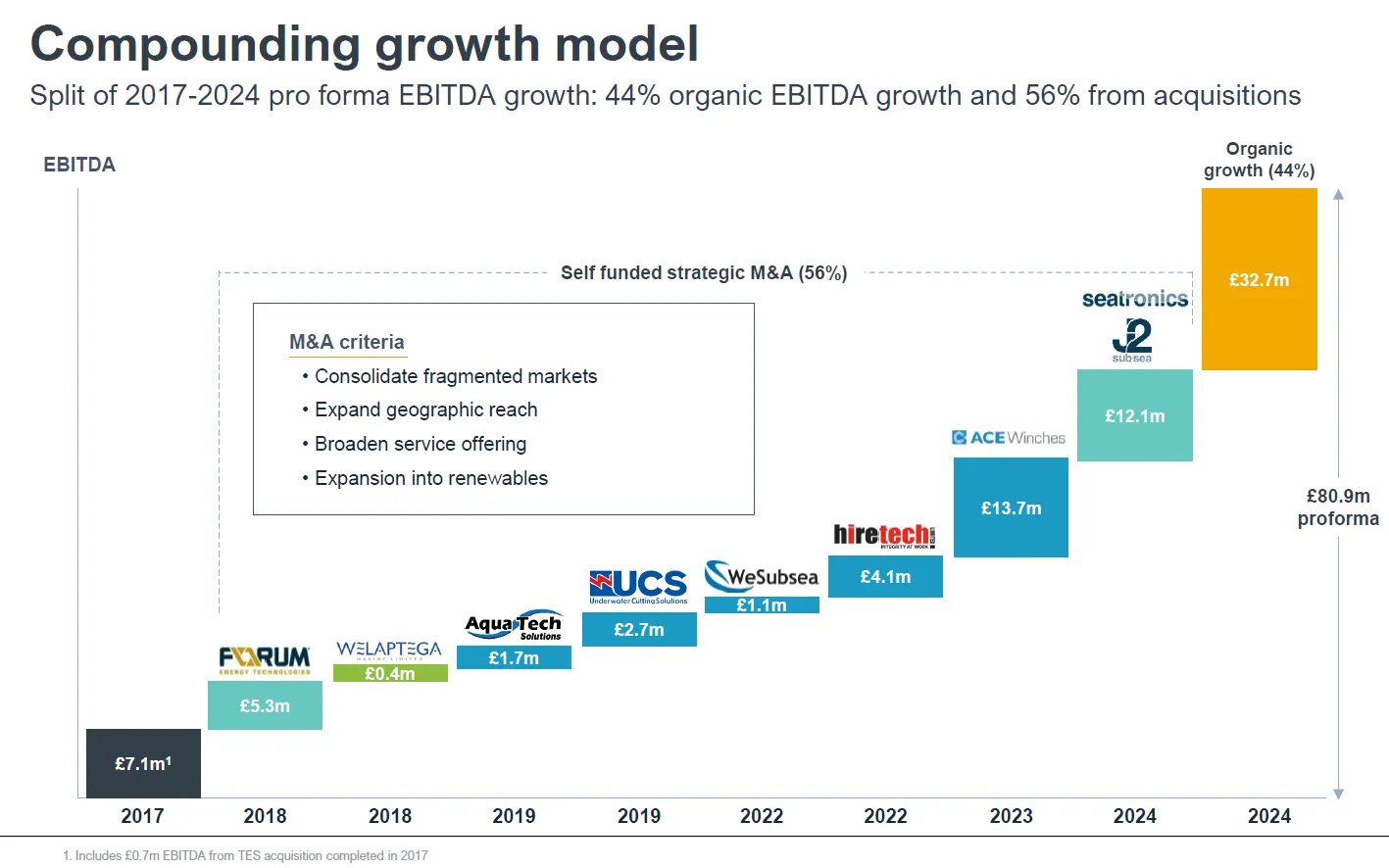 From 2017 to 2024, Ashtead Technology increased its EBITDA from £7.1 million to £80.9 million (pro forma with SeaTronics/J2 acqusition), with 44% growth from organic sources and 56% from M&A, as shown below.